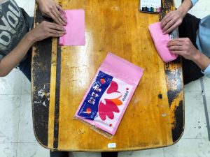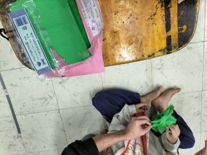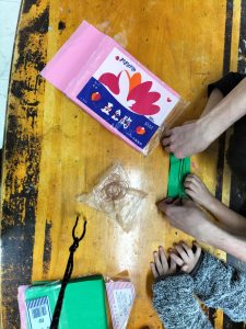 こちらは花紙を折ってます。難しい子はスタッフと一緒に折っています。