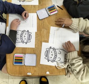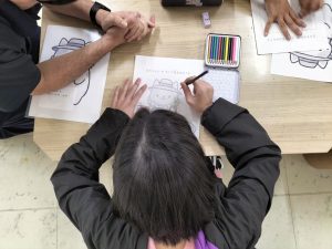 まろちゃんイラストを描いた後色塗り、段ボール工作