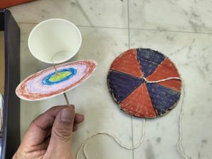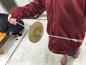 段ボールで出来たコマにたこ糸を通し、遠心力でまわすコマです!