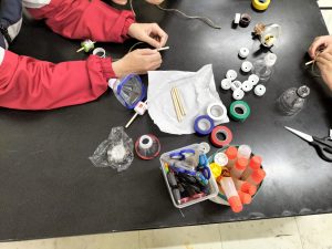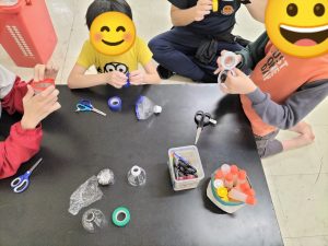 コマに糸を巻き付けて、ペットボトルの口に割り箸を通して