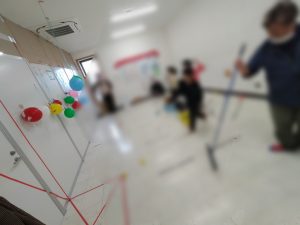 今回は、鬼の表情を切り風船を膨らませ貼っていく作業です。