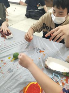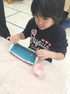 道具を使ってカットしてみたり、すこーし冷たい感触も楽しんでいました(^^)