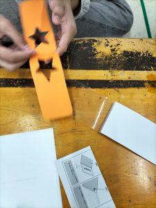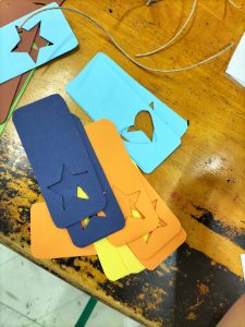 ハートや星の型が切り取られた画用紙を使って、しおりを作っていきます!