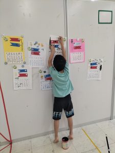 カレンダー作りでは、曜日や日付を書いてもらい、5月のイラストをはさみで切って貼り、飾る事ができていました👏