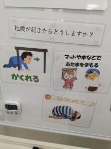 地震が起きたら、揺れが収まるまではダンゴムシのポーズなどで頭を守ります!